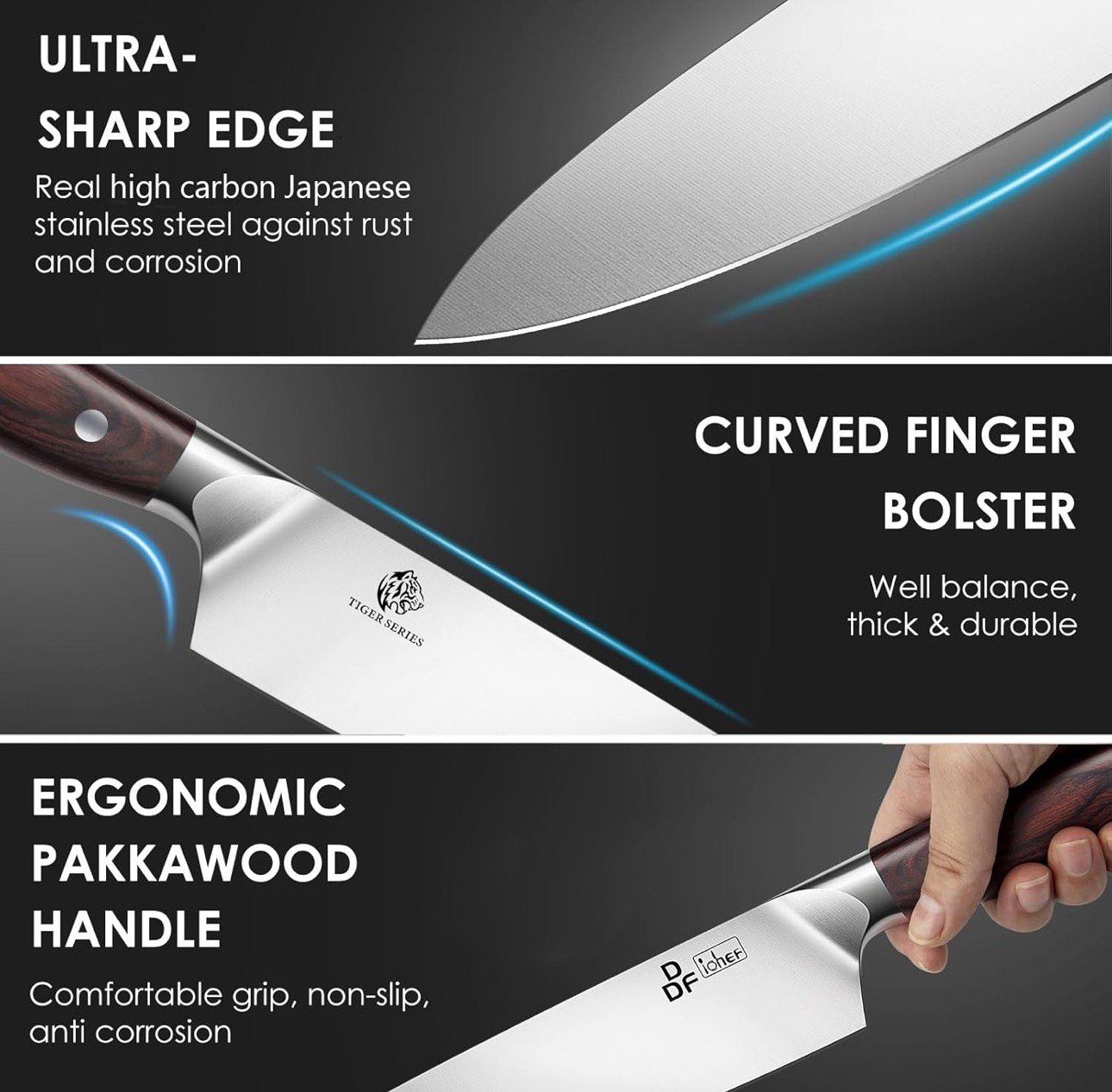 - 【TIGER SERIES – SLEEK】: Tiger Series chef’s knives are designed by our expert artisans, the blade to be sleek, fast, aerodynamic, engineered for precision and maneuverability. knife handle has the most classic and elegant dark brown appearance will be the most beautiful ornament in kitchen. It would be a ideal gift (like Father’s Day, Birthday, House Warming) for family and friends.