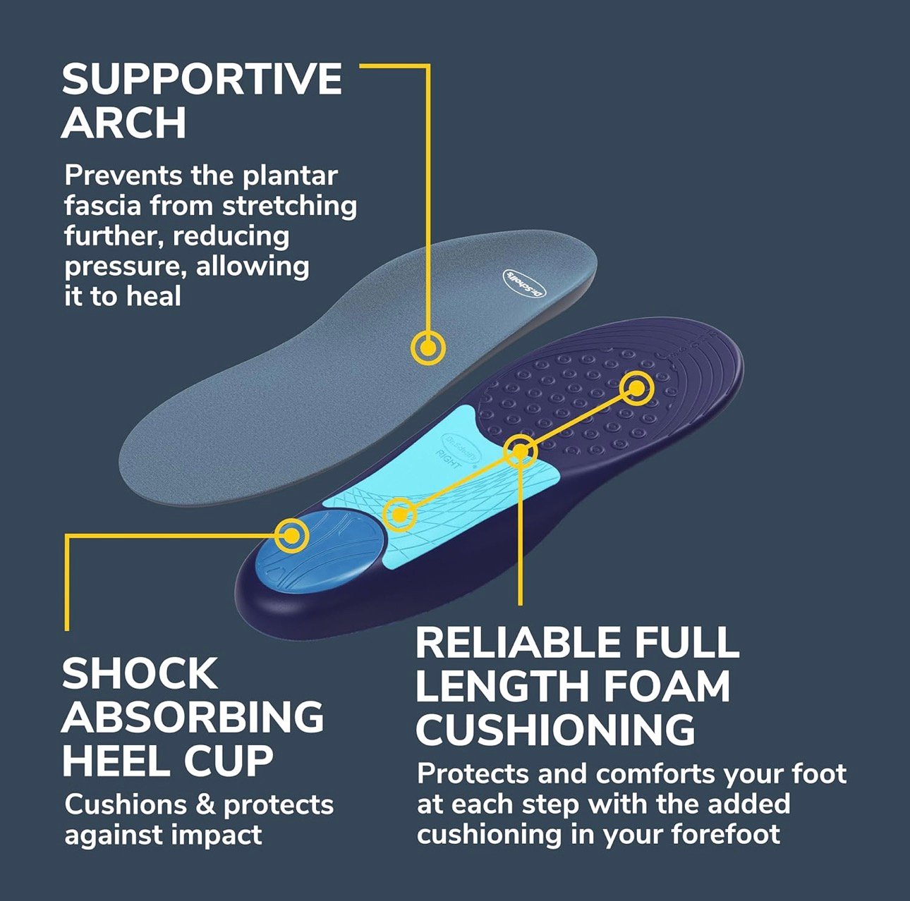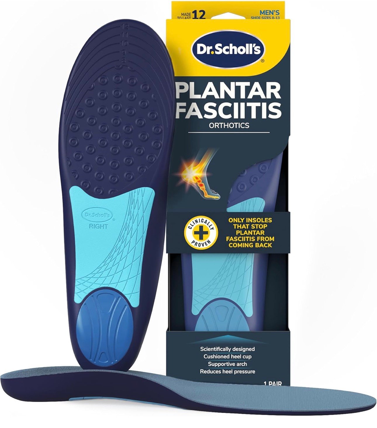 We designed Dr. Scholl’s Plantar Fasciitis Pain Relief Sized to Fit Insoles specifically for people who suffer pain from plantar fasciitis in the heel. Clinically proven to provide immediate all-day pain relief and treat the source of your pain. Targeted arch support prevents the plantar fascia from stretching and reduces the opportunity for continued injury. Shock Guard technology properly positions the heel to absorb shock and reduces pressure. Our new Relyx365 foam cushioning hugs your foot in all of the right places. We recommend wearing these insoles in your most common worn shoes everyday to prevent pain from reoccurring again. Clinically proven to provide immediate all-day pain relief and treat the source of your pain. Targeted arch support prevents the plantar fascia from stretching and reduces the opportunity for continued injury. Shock Guard technology properly positions the heel to absorb shock and reduces pressure. Our new Relyx365 foam cushioning hugs your foot in all of the right places. We recommend wearing these insoles in your most common worn shoes everyday to prevent pain from reoccurring again. 1. ShockGuard Technology: Contoured and properly sized heel cup ideally positions the bottom of the heel to absorb shock, reducing pressure on the heel to treat heel pain at the source. 2. Relyx365 Foam Cushioning: Our newest, and most reliable cushioning that hugs your entire foot, delivering optimal cushioning, shock absorption, and arch support to relieve pain and prevent it from returning. 3. 3D Targeted Arch Support: Helps prevent the plantar fascia from stretching and causing pain so you can be more active throughout the day while you heal in comfort. 4. Full Length Sized-to-Fit Design: Full-length design cushions your entire foot and ensures the arch support and heel cushioning are placed in the ideal spot of your shoe for just the right fit. No trimming required. 5. Polygiene Odor Crunch Technology: Layered with odor crunch technology that continuously eliminates and prevents odor so both your shoes and insoles stay fresh day after day. 6. Designed to Last: Our most durable foam is designed to keep its shape so you experience all of the support and comfort you need for at least 12 months of use. Plantar fasciitis occurs when the band of tissue along the underside of your foot, called the plantar fascia, is overstretched and aggravates the attachment at the heel bone. This can cause pain with every step you take. Dr. Scholl’s Plantar Fasciitis Pain Relief Sized to Fit Insoles provide dual-action relief by treating the source of your pain. The targeted supportive arch of the insole prevents the plantar fascia from stretching and reduces the opportunity for continued injury. While the contoured sized heel cup properly positions the heel to absorb shock and reduces pressure to treat pain at the source.