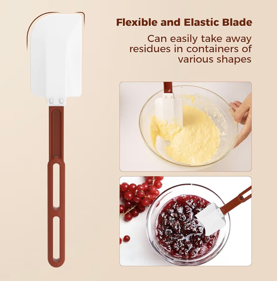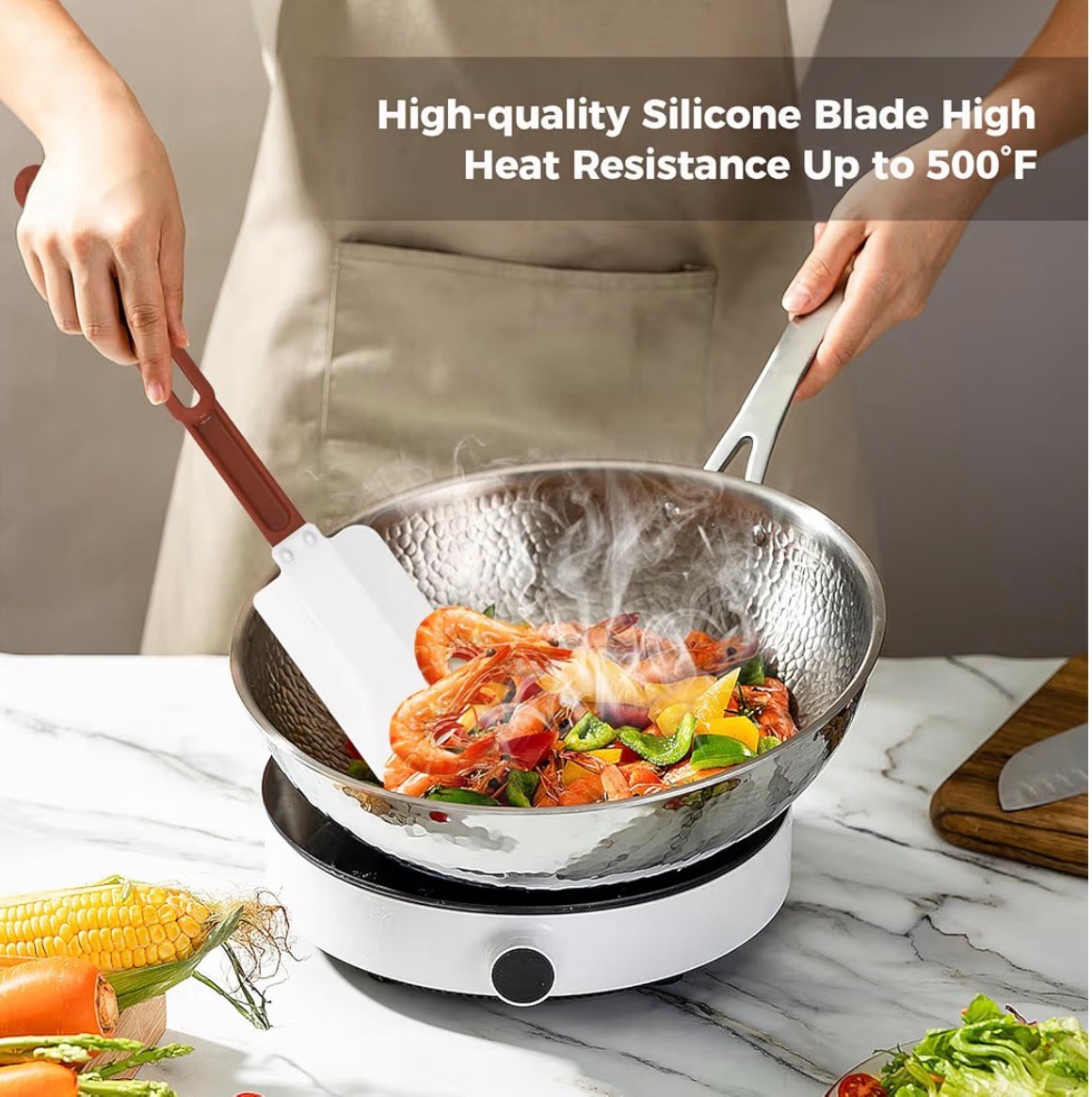 - 【Long Handle Design】 The size of this commercial spatula: 13.6 inch. The 8.8 inch long handle keeps the hand far enough away from the high-temperature cookware, which considers the safety of the user intimately. At the same time, this long-handled spatula can also easily reach the bottom of various large bowls and then scrape the residue from the bottom of the bowl.