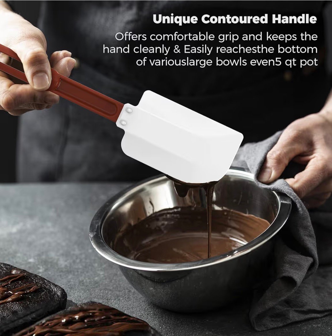 - 【Made of High-quality Materials】 Food-grade silicone blades and nylon handles can Resists heat up to 500 degrees F or 260 degrees C. There is no peculiar smell when used at high temperature, and it’s built to last and will not crack, suitable for cooking or mixing large batches of food such as caramel or toffee. Meets the standards of NSF, 100% food safety.