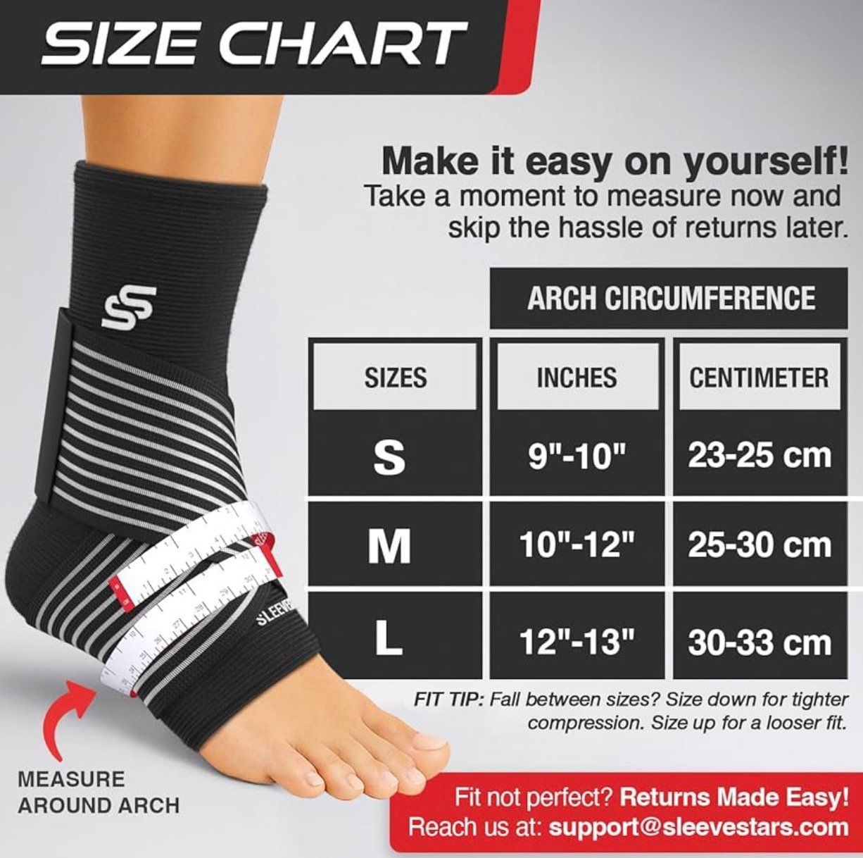 - ✅ Your comfort matters most: At Sleeve Stars, we prioritize your satisfaction. Contact our Customer Happiness Team with any questions or challenges with our plantar fasciitis brace or other products.
