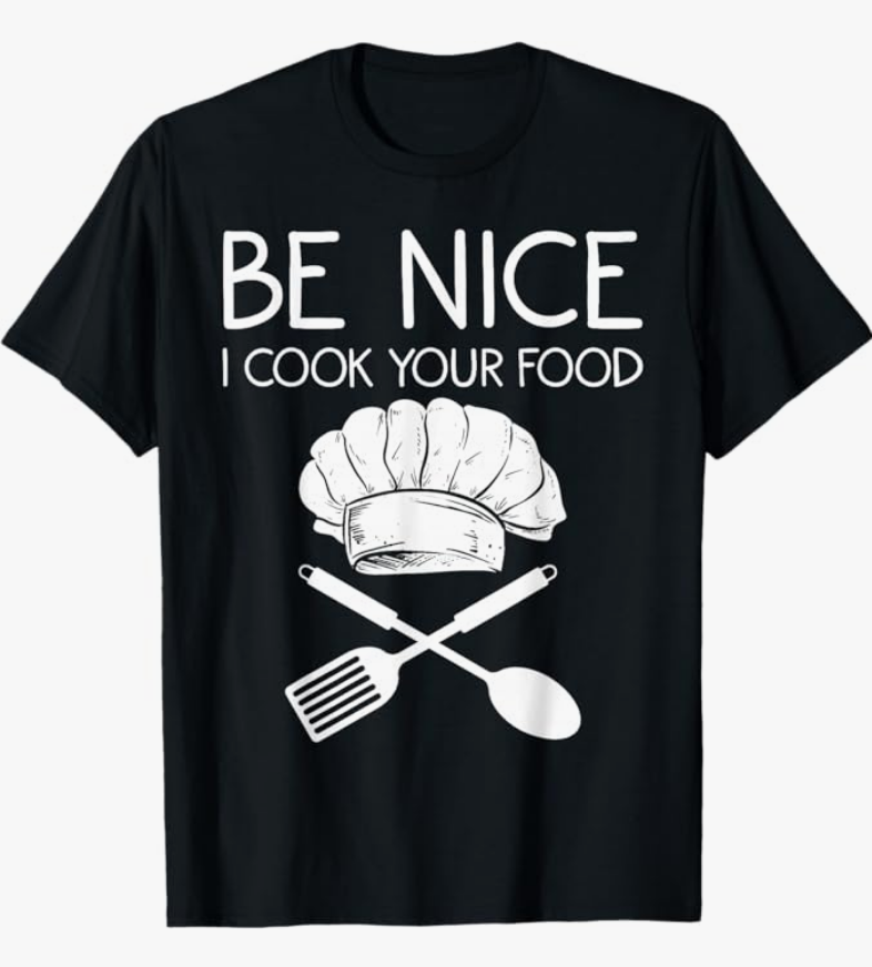 - Funny chef gift idea with “Be nice I cook your food” for men, women, boys, girls, teens, youth, mom, dad. Restaurant owner saying apparel for culinary student brother, sister, kids, toddler. Cool young male chef novelty must haves in home kitchen.