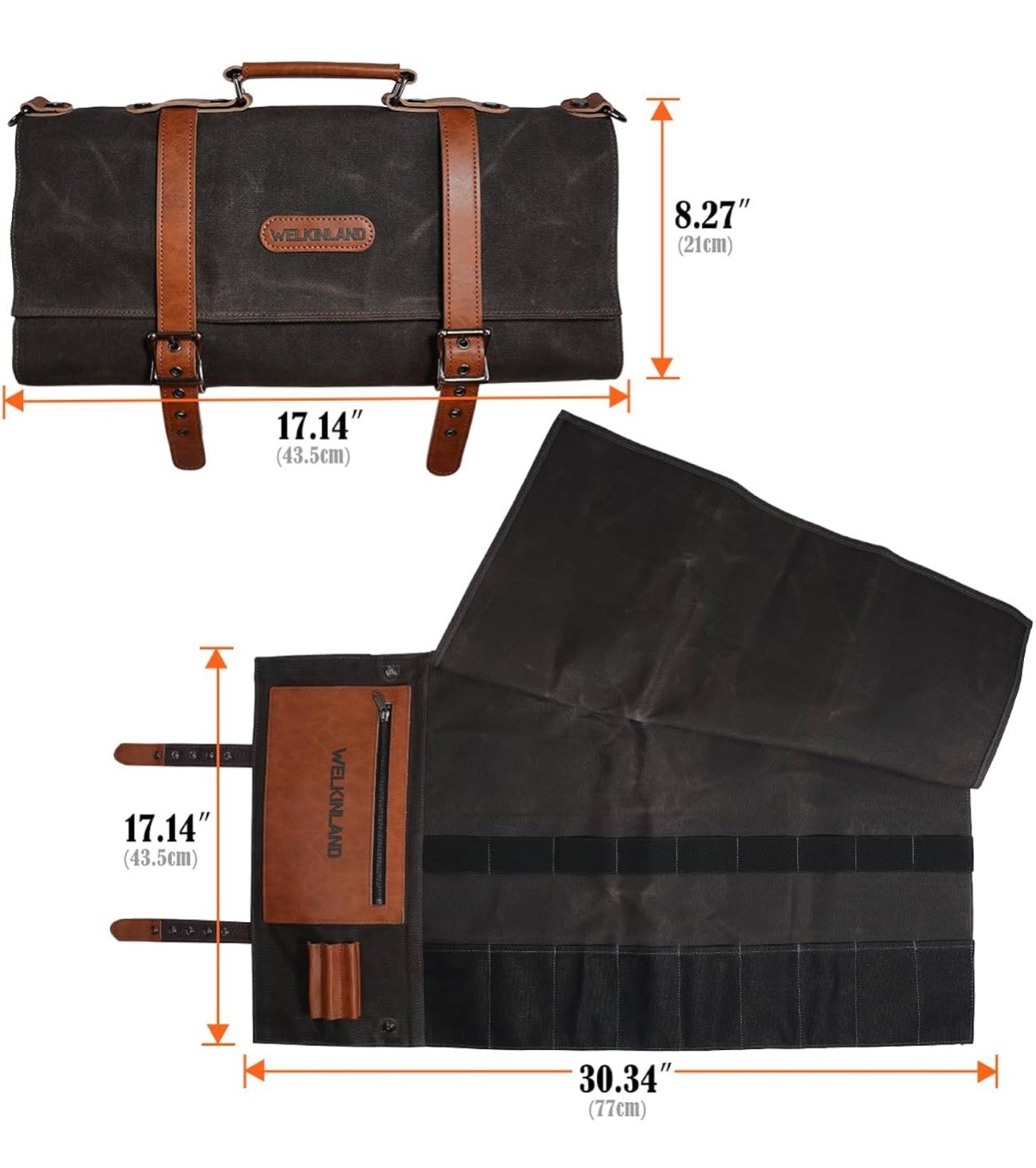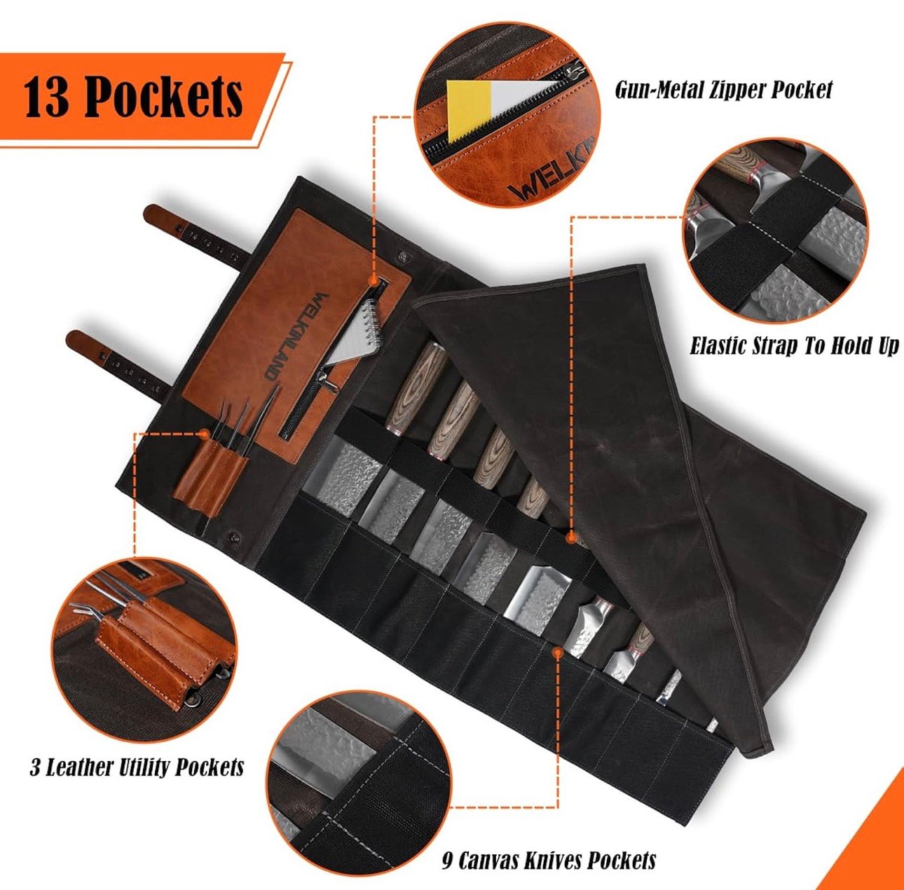 - Easy-Organize: This waxed canvas knife roll has 9 slots of three sizes, 3 accessory pockets, and 1 zipper pocket for different sizes of knives.A must-have knife roll bag for every chef on the go.