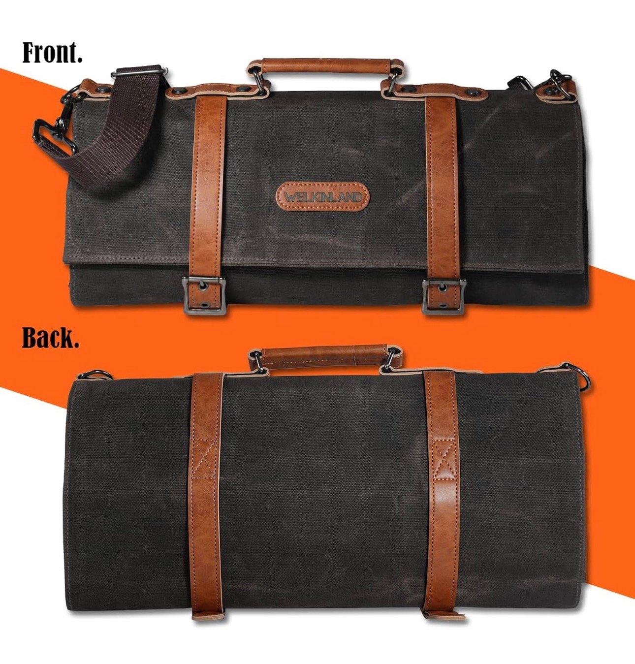 - Heavy-Duty: This chefs knife roll is made of 20oz double-sided waxed canvas with premium leather and gunmetal fittings that resist tears and punctures. Ideal knife set bag to take with you on the go.