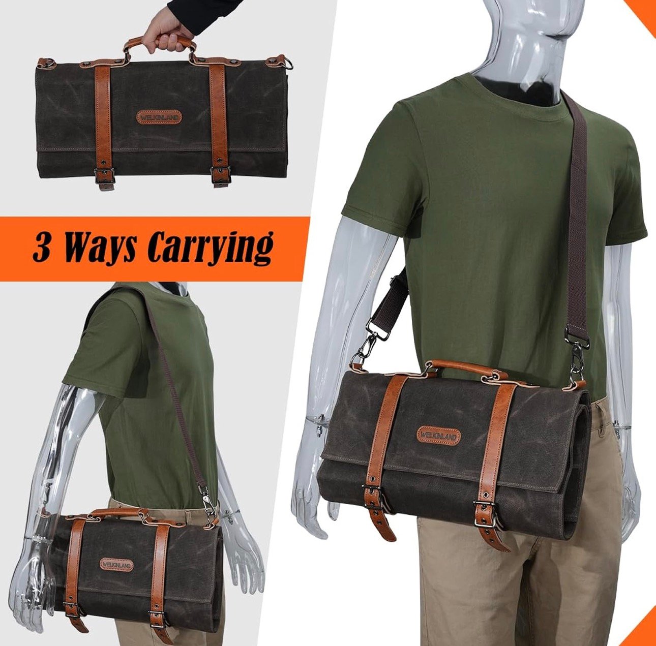 - Easy-Carry: This 13 pockets knife roll has a detachable shoulder strap, ergonomic leather handle and three ways to carry (diagonal/carry/side carry), use our knife roll to make your traveling easier.